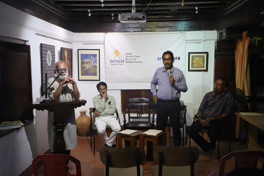 Moderated by INTACH Mangaluru Convener Subhas Basu, the session featured guests Kallur Nagesh, publisher of the Kannada edition; Prof. Krishnamurthy, retired principal of Govinda Dasa College, Surathkal; and artist-environmentalist Dinesh Holla.