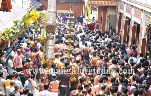 Mangalore, Feb 18, 2013 : Temple Square at Carsteet in Mangalore turned colourful on February 18, Monday when Okuli’ the festival of colors is being celebrated to mark the end of the six day festivities as part of Kodial Theru or Car Festival.