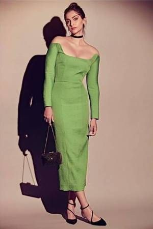 Sonam Kapoor nailed an off-shoulder leaf green Emilia Wickstead dress. She kept the overall look simple and accessorised it with a black choker from Mahesh Notandas. Stylist and sister Rhea Kapoor rounded off her look with Dolce Gabbana flats and a sling bag from Judith Leiber.