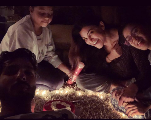 In the first picture, it can be seen that her daughters have their head on her lap as she sits in-front of a cake placed in the middle of what looks like a heart made out of yellow coloured fairy lights.