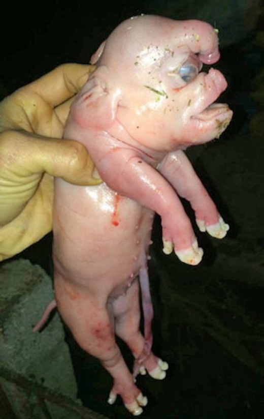 China, Feb 10, 2015: A farmer says he was inundated with cash offers for a pig born with a human face and a PENIS on its forehead after photos of the newborn ’mutant’ went viral.